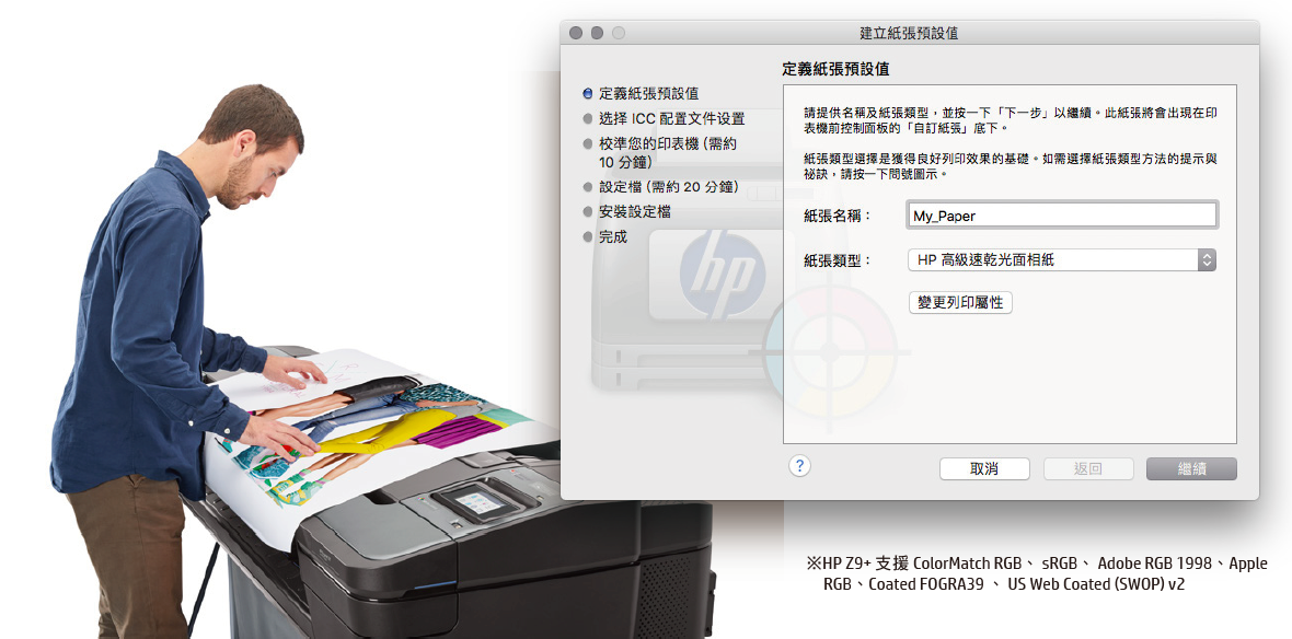 Z9+ 系列機型皆內建 i1 分光儀,可針對裝入的原廠媒材進行色彩較準以確保每次輸出色彩一致,並可透過HP Utility App 進行自訂材質建立色彩描述檔,讓材質應用更加自由多樣。