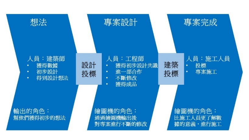 以建築行業為例,首先是市場調查,然後規劃可行的研究報告、藍圖,並根據專案建議書的內容作調整。在前期設計方案時,客戶會以3D示意圖的成果,來決定是否投資,因此,其輸出的質量是專案成功與否的關鍵。
